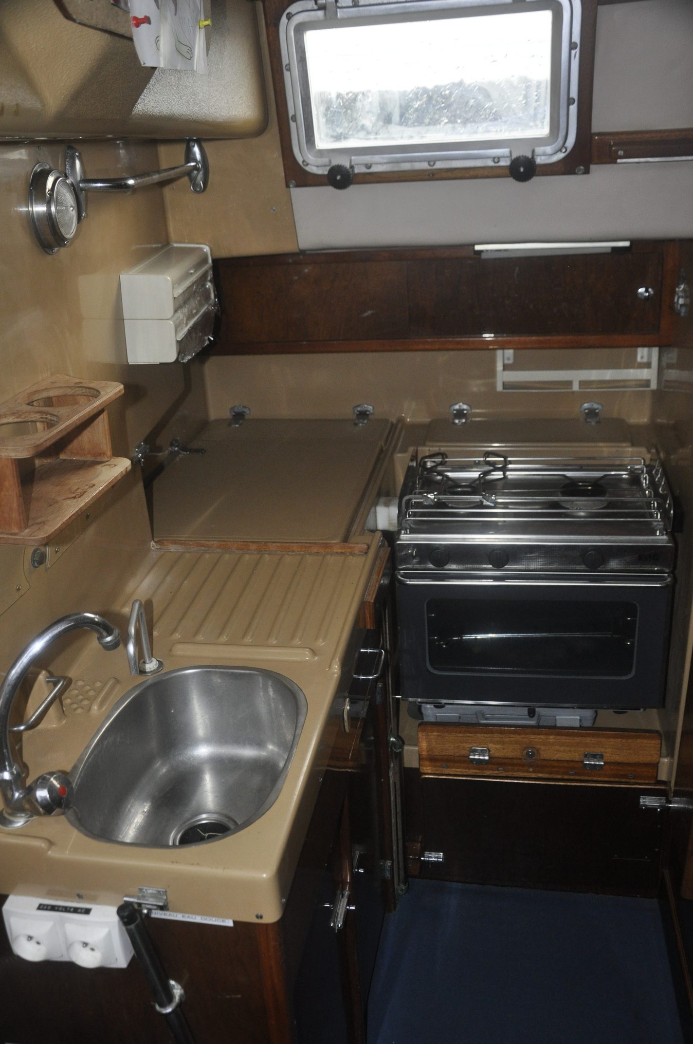 Cuisine sur bâbord avec 1 hublot ouvrant avec rideau
