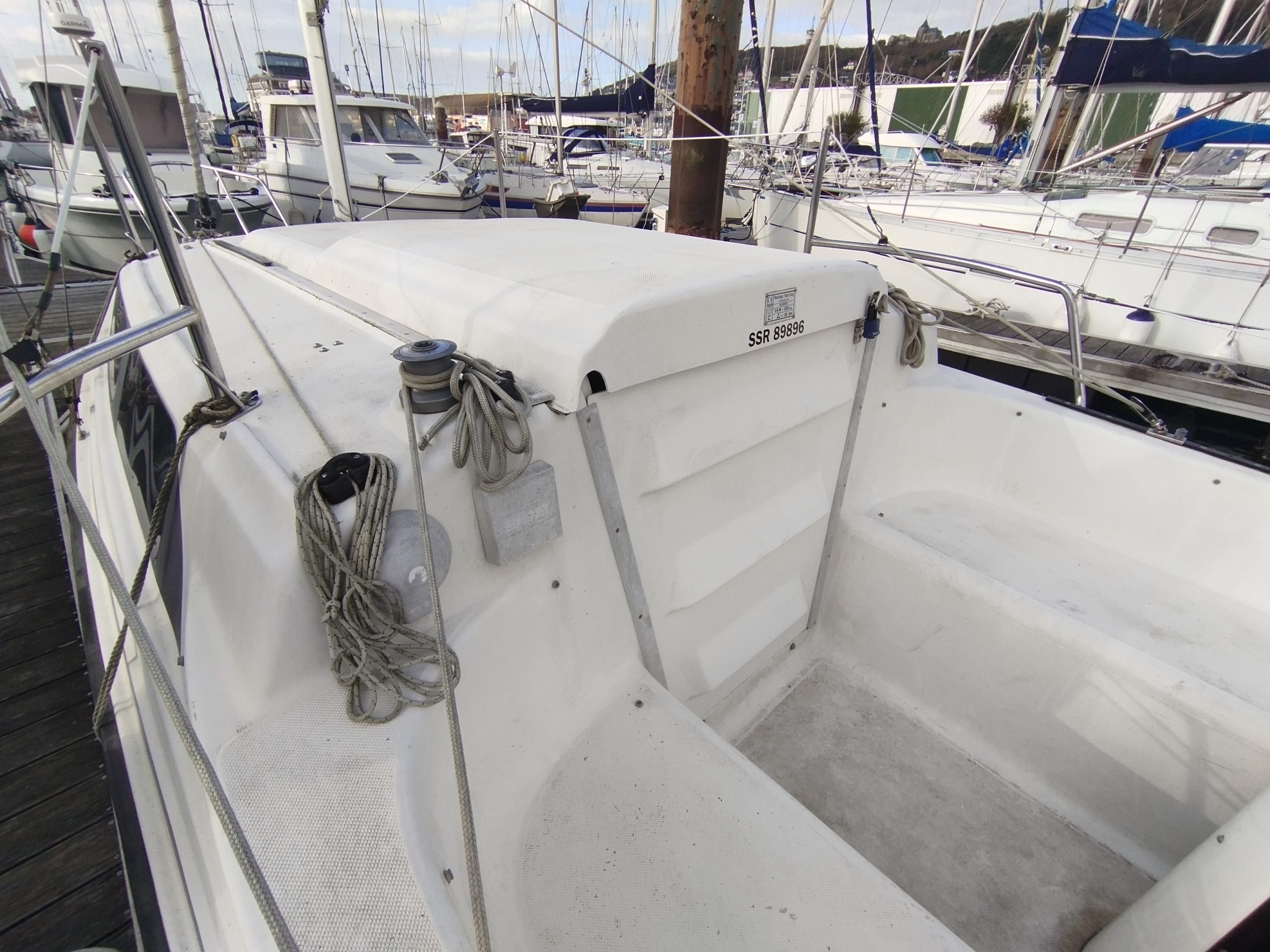 Un mouillage principal avec une ancre à poste, chaîne et câblot dans baille à mouillage